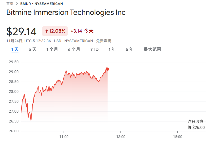 不過值得注意的是,BitMine 在台灣時間 11 月 24 日晚間美股開盤後迎來反彈,盤中一度衝上 29 美元。盤中漲幅高達 12%,市值也回升至 74 億美元。