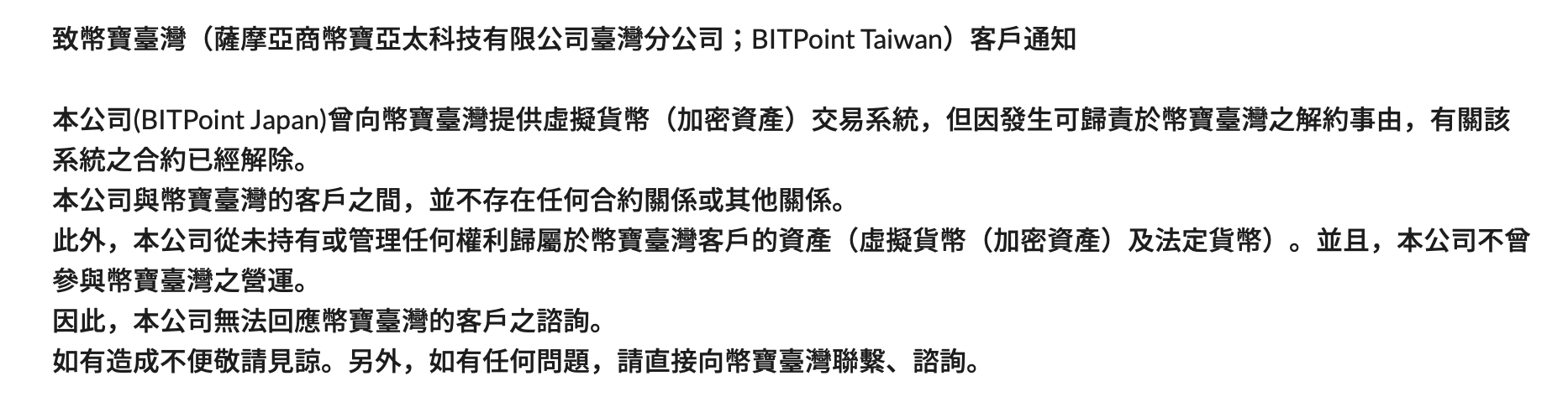 本公司(BITPoint Japan)曾向幣寶臺灣提供虛擬貨幣(加密資產)交易系統,但因發生可歸責於幣寶臺灣之解約事由,有關該系統之合約已經解除。