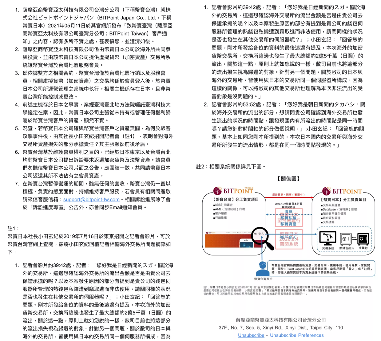 另外動區也取得了幣寶台灣昨天發送給用戶的信件,全文截圖如下: