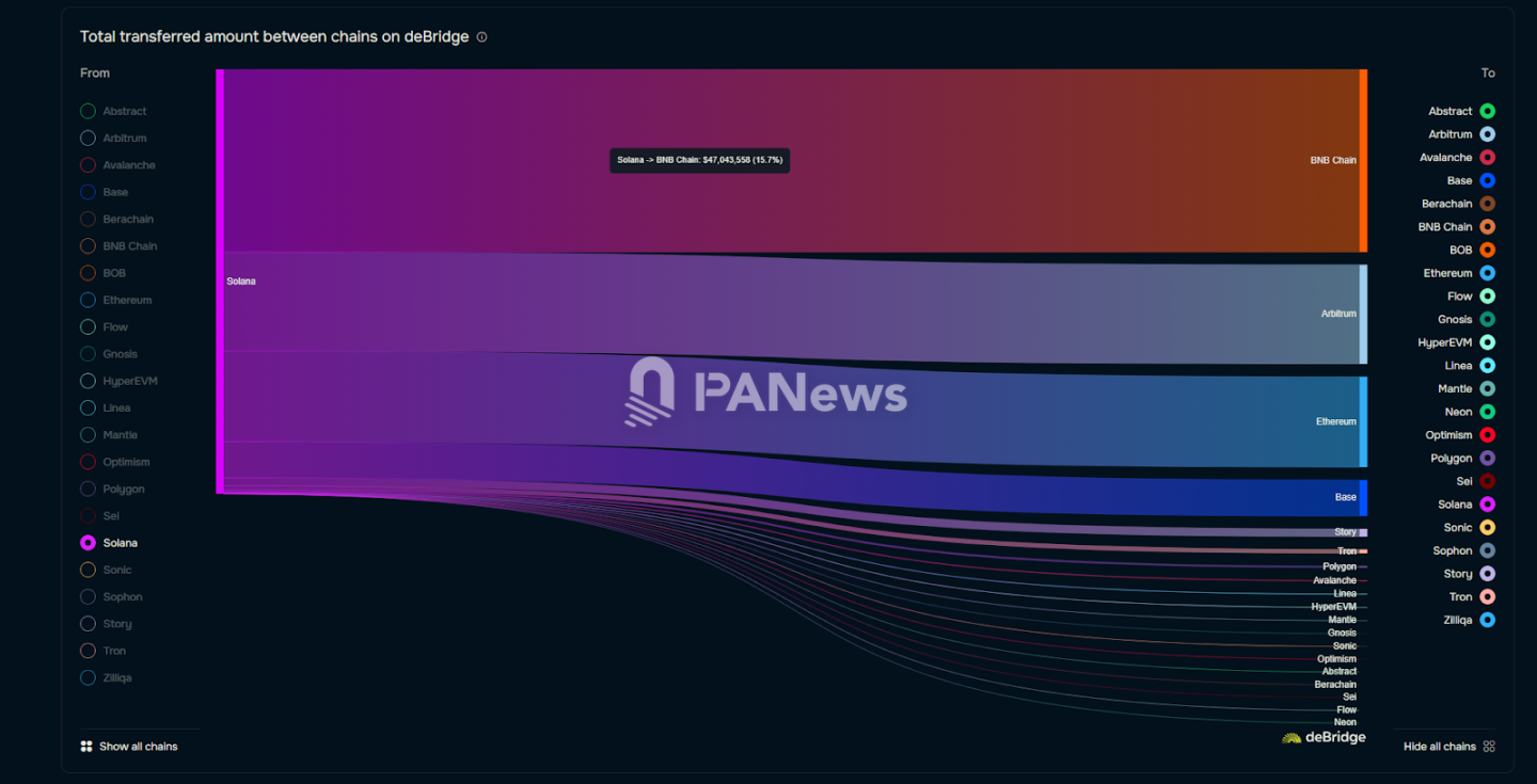 資金流動方面,近一週內 BSC 的淨流入資金約為 7350 萬美元,是流入資金量第三的公鏈。從 deBridge 的數據來看,流入主要來自 Solana、Arbitrum 和以太坊主網。