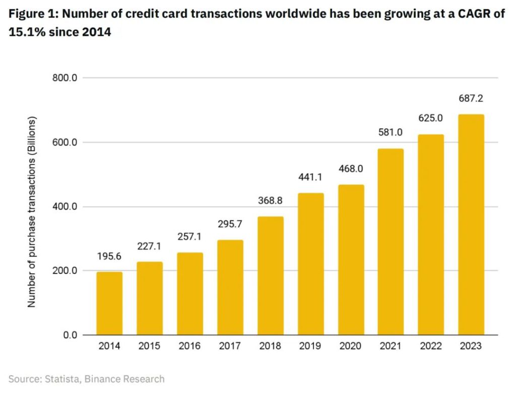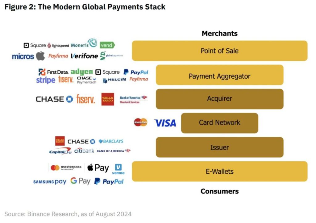 儘管支付行業是全球規模最大、增長最快的行業之一,但它仍然主要依靠過時的、已有 50 年歷史的銀行基礎設施執行。Stripe、Mastercard 和 Visa 等現代支付金融科技和卡組織網路為消費者和商家帶來了更加便捷的終端使用者體驗。然而,每筆交易中涉及多達六個中介機構(例如卡組織、髮卡商、處理商、POS 系統、支付聚合、數位錢包)的傳統成本仍然存在。區塊鏈技術為支付提供了一條全新的全球基礎設施軌道,這是一個新的開始。
