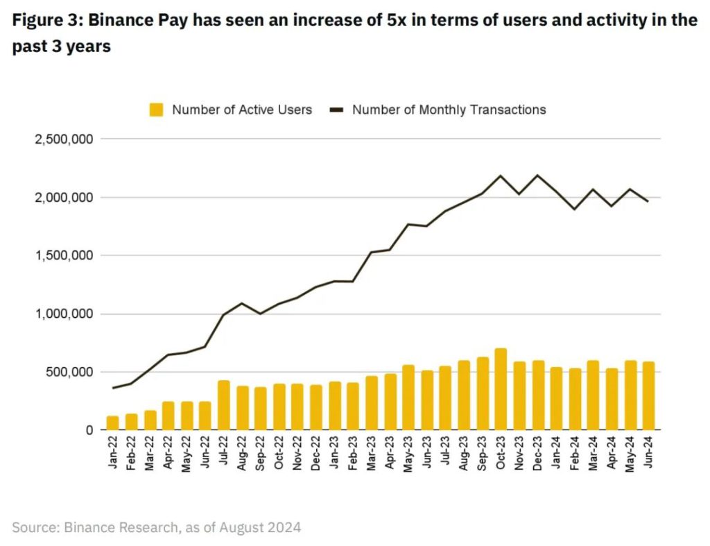 如今,全球有多達 14 億成年人沒有銀行帳戶。出於這些原因,我們看到世界各地的使用者都轉向使用 Binance Pay 等區塊鏈解決方案作為更便宜、更快捷的跨境轉帳方式。自 2022 年以來,Binance Pay 的月活躍使用者和月交易筆數都增長了近 5 倍,全球使用者數約為 1350 萬,月交易筆數約為 196 萬筆。