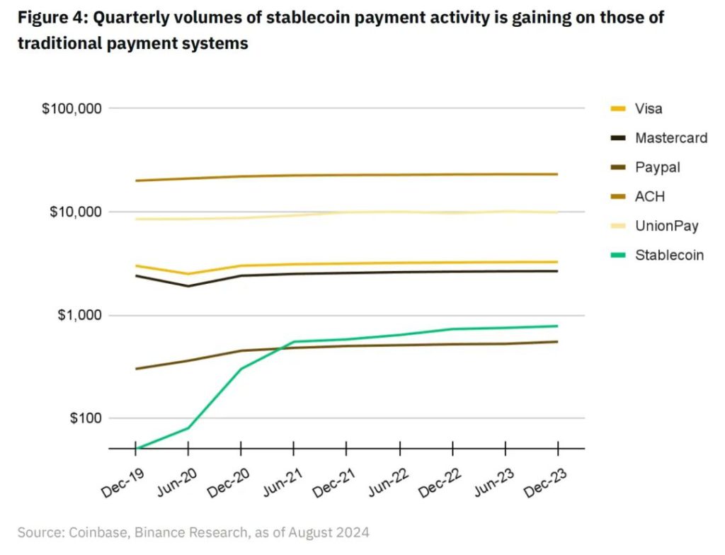 將穩定幣支付與傳統支付進行比較,我們可以看到,就季度交易量而言,它們一直在趕超傳統支付。
