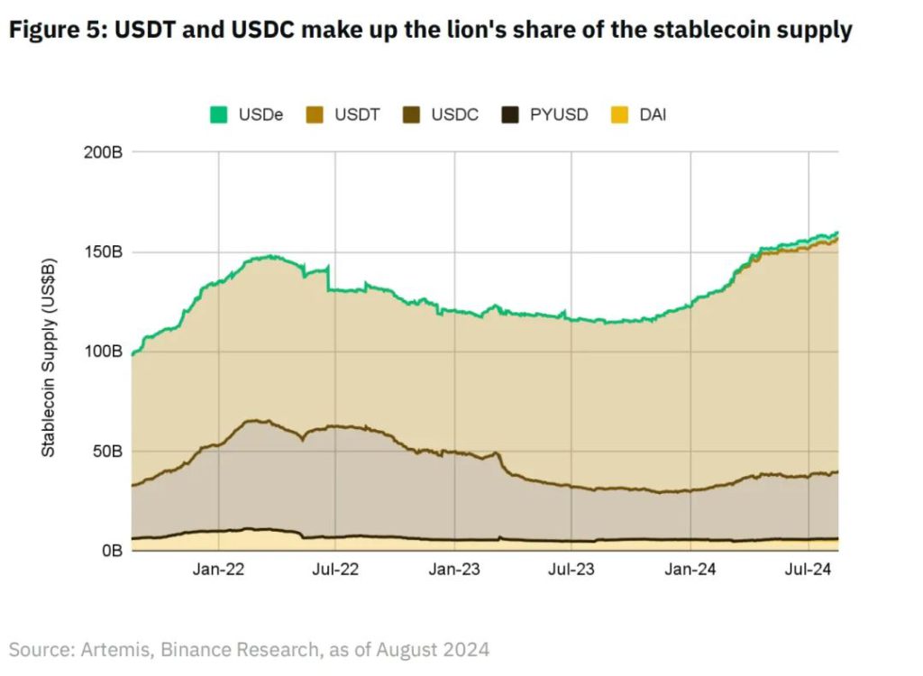 自 2023 年中期以來,穩定幣的總供應量也一直在增加,表明需求穩步增長。主要穩定幣的總市值超過 1600 億美元,其中 USDT 和 USDC 佔據最大份額,市場佔有率分別為 73% 和 21%。