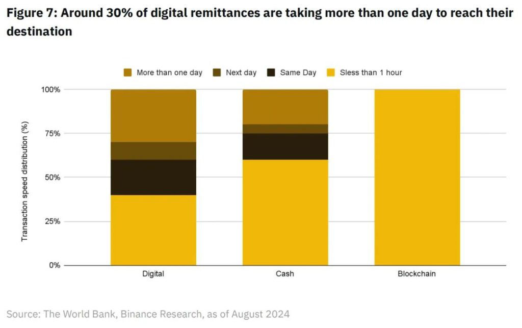從匯款交易時間來看,跨境銀行間通訊系統的低效率顯而易見。有點違反直覺的是,大約 30% 的匯款需要一天以上的時間才能到達目的地;這一比例高於需要相同時間現金匯款的 20%。