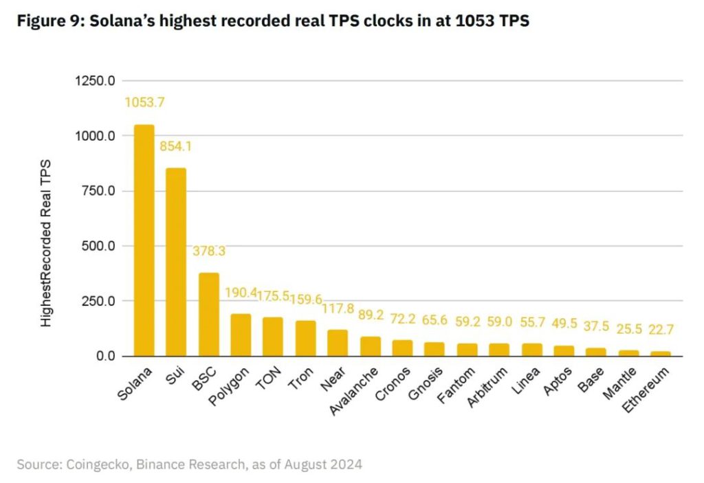Solana 是迄今為止記錄的每秒使用者生成交易數 (TPS) 最高的區塊鏈,其每日平均 TPS 最高略高於 1,000。據報導,Sui 緊隨其後,實際最高 TPS 超過 850。BNB Chain 在這個指標上排名第三,為 378.3 TPS。