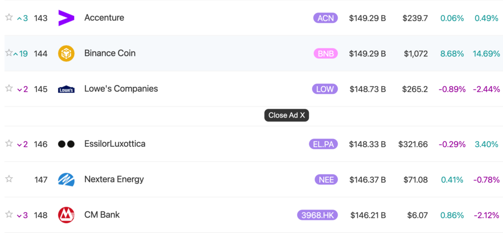 隨著 BNB 持續寫下歷史新高,據 8marketcap 數據顯示,目前 BNB 以 1,492 億美元的市值,超越先鋒集團、Intel 等知名企業,成為全球排名第 144 大的資產。