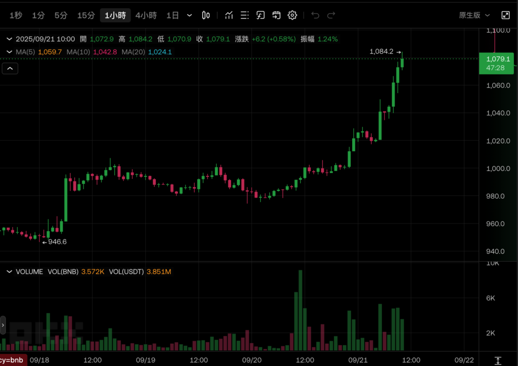 幣安平台幣 BNB 在 18 日突破 1,000 美元,開啟窄幅震盪之後,今(21)日零點過後再次開始發力,過去幾個小時持續創下歷史新高,截稿前最高觸及 1,084.2 美元,讓空軍損失慘重。