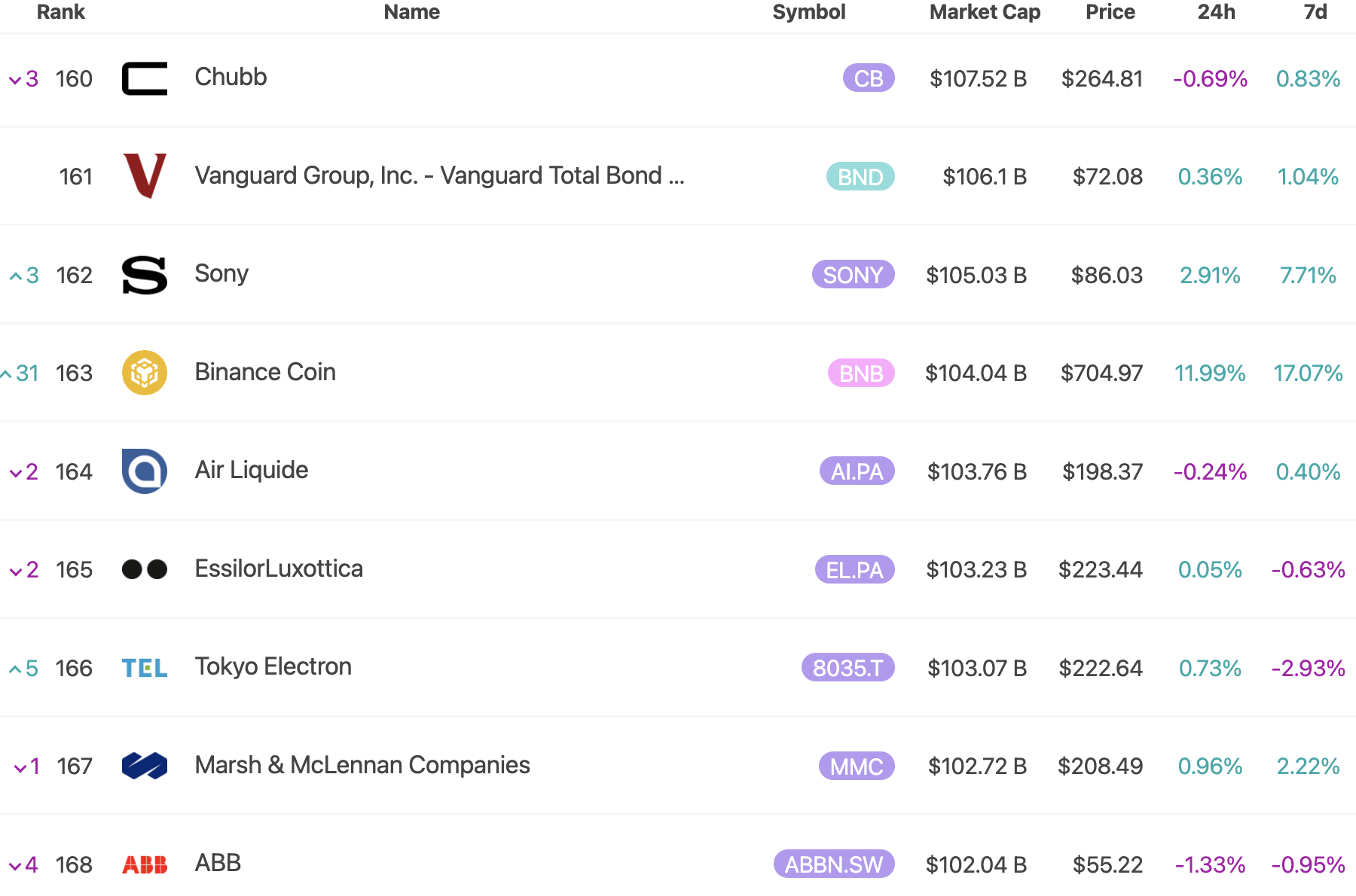 據 8MarketCap 即時數據顯示,BNB 市值已接近全球最大的電子產品製造商之一 Sony(市值 $105.03B)、並已經超過全球最大的工業氣體供應商之一 Air Liquide 和全球領先的眼鏡及眼鏡鏡片製造商 EssilorLuxottica (分別市值為 $103.76B 和 $103.23B),讓 BNB 成為全球第 163 大資產。