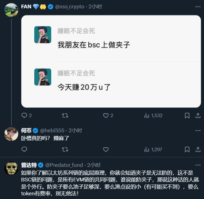 另外也有人表示,在所有 EVM 鏈上,夾單問題是一種技術問題,是無法避免的,「防夾子要麼是池子足夠深,要麼滑點設的小(有可能買不到),要麼 token 有費率,否則別無他法!」。