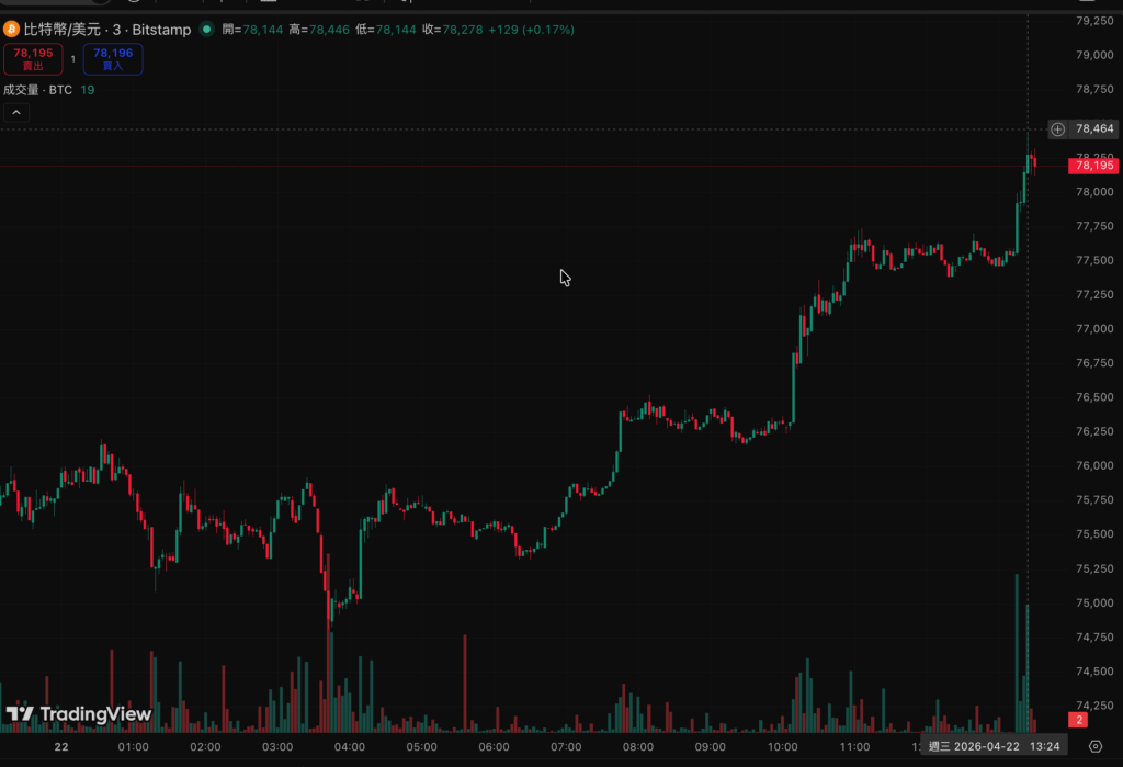 比特幣今日強勢突破 $78,000 關口,截至臺灣時間 4 月 22 日下午,BTC 現報 $78,389.79,單日漲幅 +3.19%,24 小時交易區間介於 $74,821.57 至 $78,450 之間,站上近 14 天以來的價格高點。以太幣同步跟進,ETH 現報 $2,393.21(+3.21%),距 4 月 18 日峰值 $2,451 約 2.4% 之差。