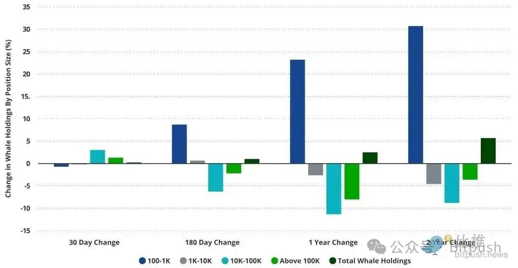 較小巨鯨在 1-2 年內累積、而最大巨鯨在賣出;近期淨變化持平