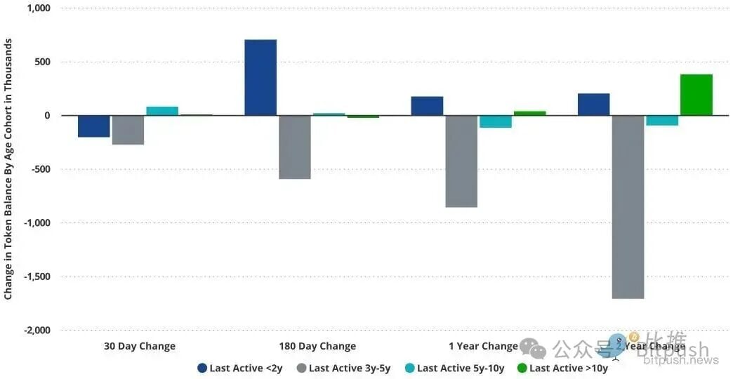 在較老的群體中,即那些代幣最後一次移動發生在 >5 年前的持有者,代幣周轉率相對於其他群體仍然較低。相比之下,最大的流失發生在最後一次移動時間為 3-5 年前的代幣中,該群體在每個研究期間都持續下降。