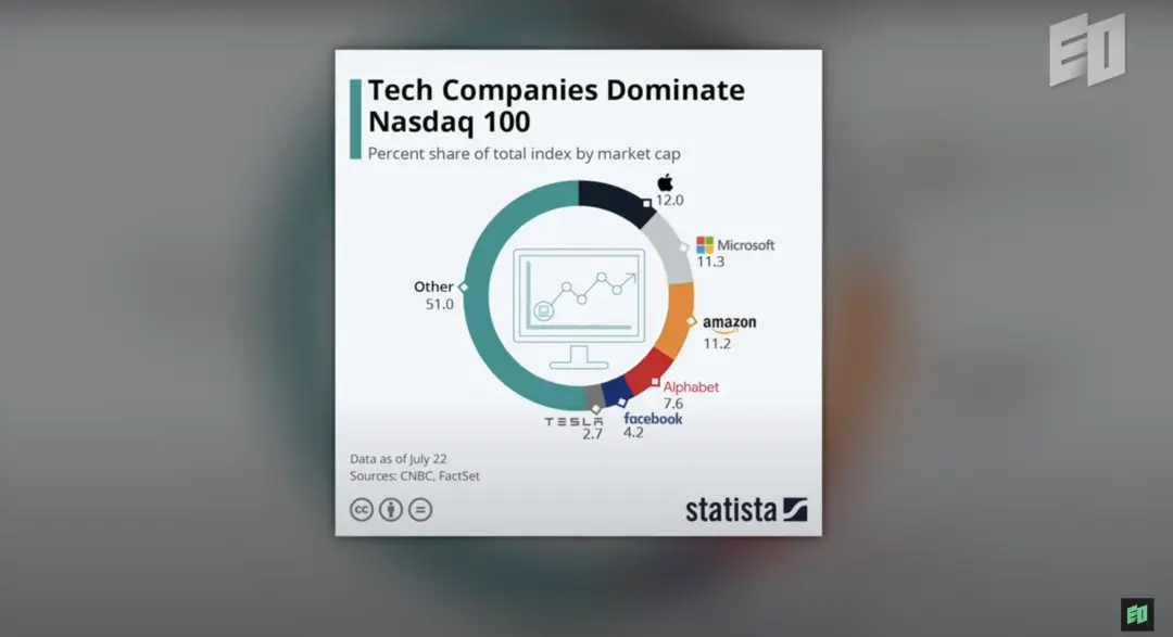 快進到今天,前五大科技公司佔據了納斯達克 100 指數市值的 50%,網際網路上的流量和收入有 95% 以上集中在這幾家公司手中,所有的趨勢表明這種集中化還會繼續加劇。