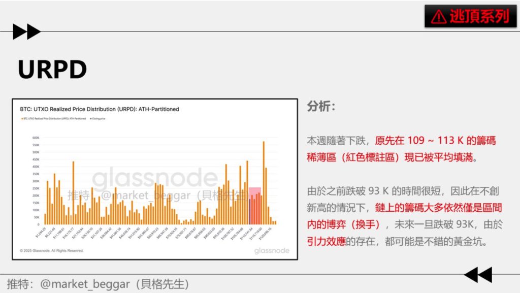 本週的下跌,將先前在 109 ~ 113 K 的 URPD 籌碼稀薄區作了填補,