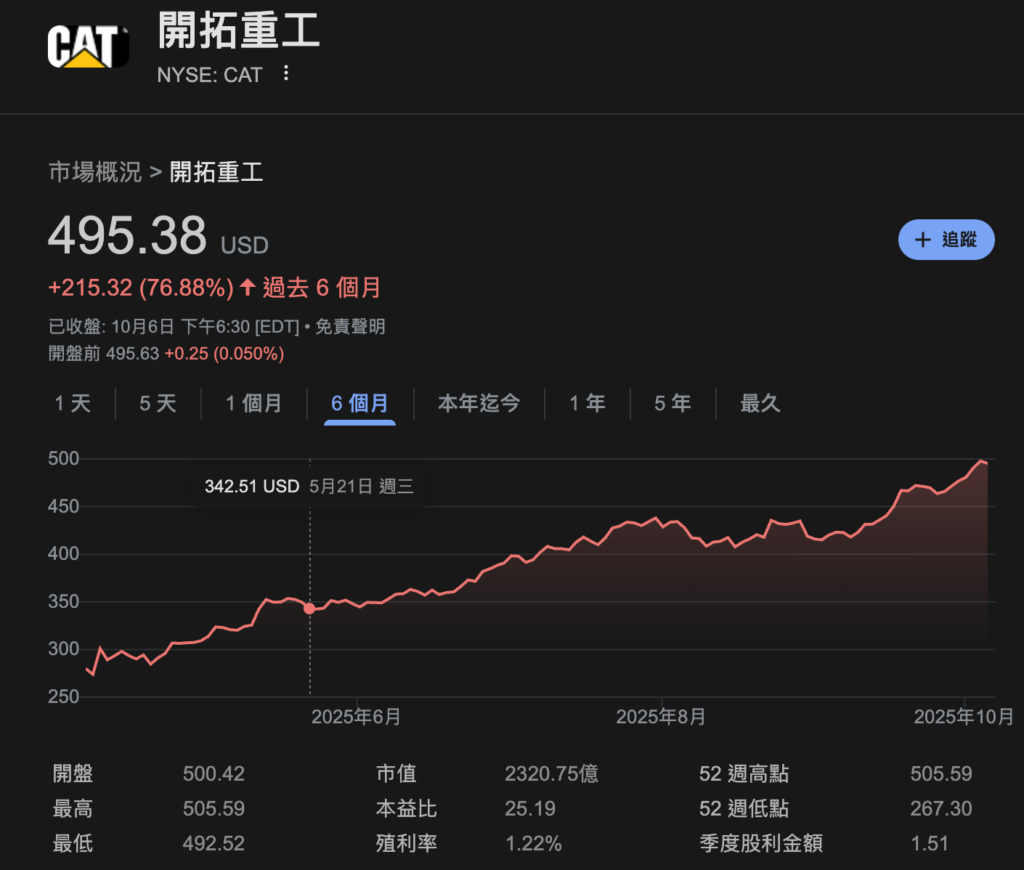 當投資人盯著 AI 晶片、雲端計算與大型語言模型時,很少人會把黃色重機具聯想到新科技浪潮。但 2025 年 9 月,Caterpillar 股價連續八個交易日走高,刷新歷史紀錄,相比半年前價格已整整翻倍,正說明 AI 的「電力胃口」已重塑華爾街對基礎設施的想像。