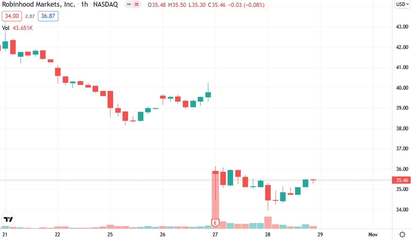 美國線上券商羅賓漢(Robinhood) 10 月 26 日公布 Q3 財報,表現不佳導致股價重挫超過 10%、失守 IPO 起始價 38 美元。