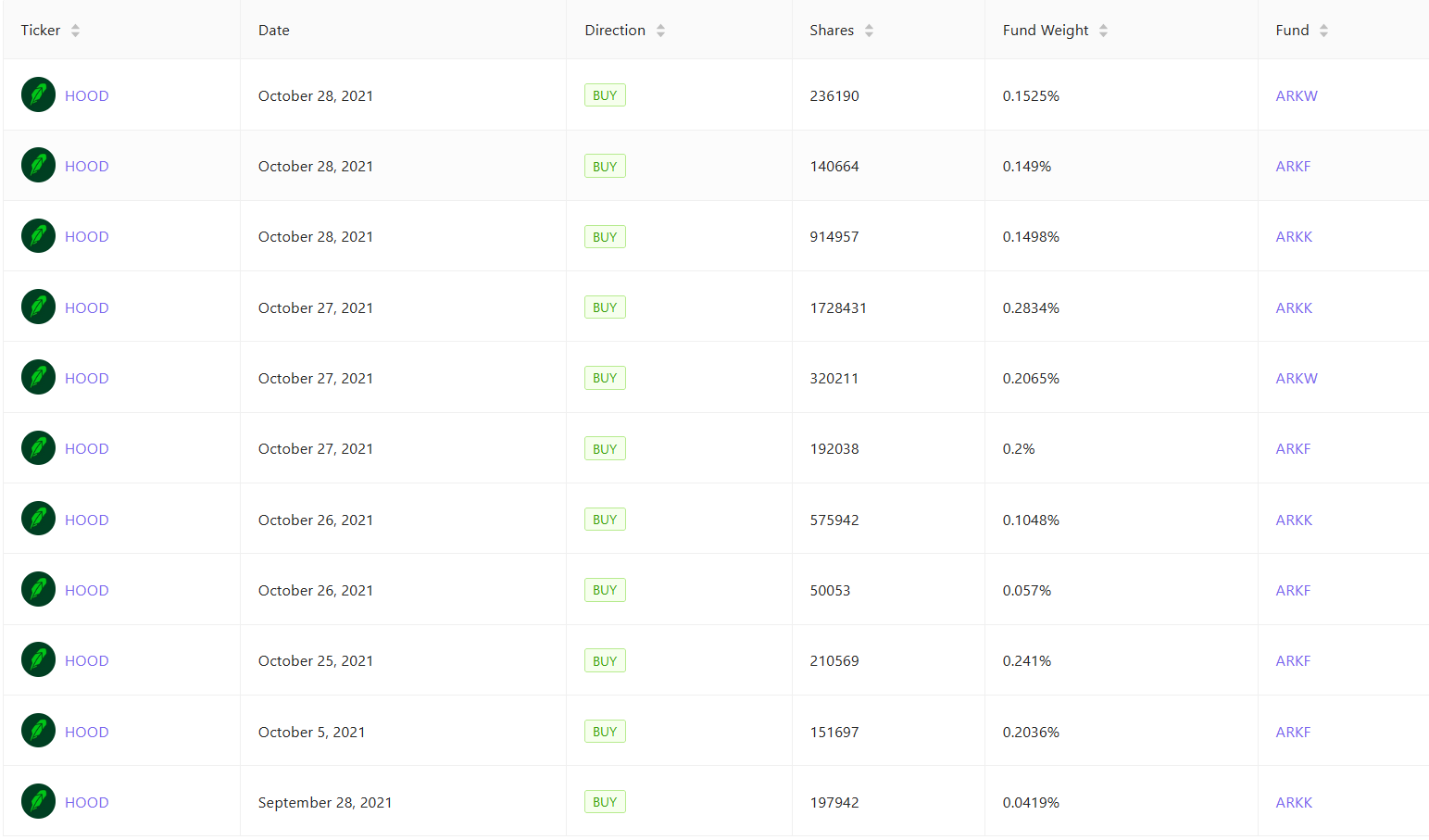 女股神凱希伍德和方舟投資顯然對 Robinhood 前景抱持樂觀,在 10 月 27 日豪灑 7,940 萬美元接球,一口氣買進 2,240,680 股 HOOD。