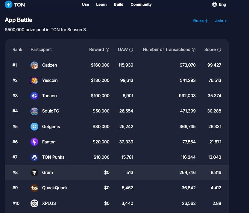 Catizen 的快速成長從 TON 區塊鏈官方開放聯賽賽季排名中可見一斑,它在應用程式之戰中贏得了兩個賽季的獎勵,爭奪 50 萬美元的獎金池。