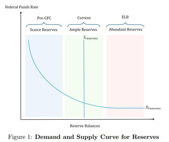 傳統架構認為,聯邦儲備銀行縮表的約束來自於”準備金供給觸及需求曲線陡峭區間”—一旦供給收緊至臨界點,隔夜利率就會失控。因此,聯邦儲備銀行只能等準備金降至”稀缺”狀態後被動停止縮表。 2019年9月的”回購市場地震”,正是這一邏輯的現實演繹。