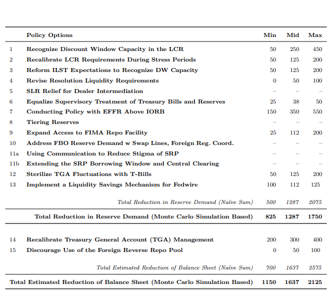允許有效聯邦基金利率(EFFR)高於IORB,即打破當前EFFR長期低於IORB的狀態。論文引用Lopez-Salido與Vissing-Jorgensen(2025)框架估算,若以”EFFR-IORB = +2bp”為參考(接近2019年9月壓力水平),對應準備金需求下降區間為1500億至5500億美元。
