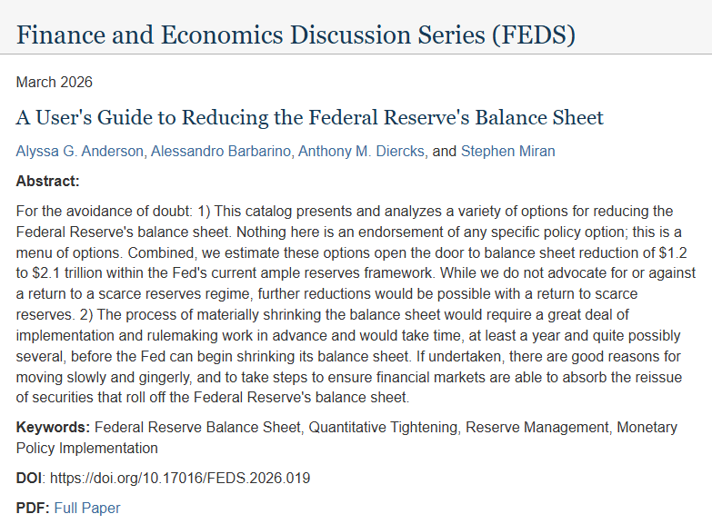 事實上,自2025年底以來,聯準會資產負債表的走向便始終是全球金融市場高度關注的核心議題。在此背景下,聯準會理事史蒂芬·米蘭聯合三位聯邦儲備銀行經濟學家,近期共同發布工作論文《縮減聯準會資產負債表使用者指南》,並於2026年3月26日藉用邁阿密經濟俱樂部主題演講之機,系統闡釋了聯儲縮表的戰略邏輯與潛在路徑。