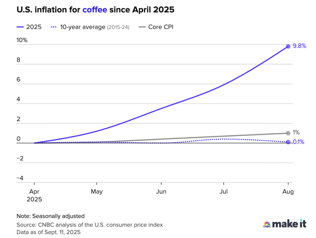 咖啡價格從四月到八月上漲了 9.8%,僅上個月就飆升了 3.6%。今年早些時候收成不佳已經使供應緊張,但在新進口關稅生效後,價格上漲速度明顯加快。