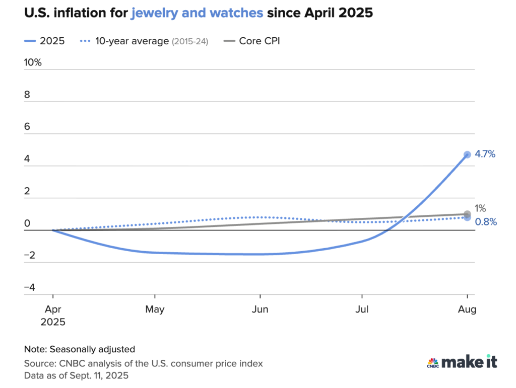 珠寶和手錶價格在八月激增 5.5%,遠高於其歷史平均月漲幅 0.8%。
