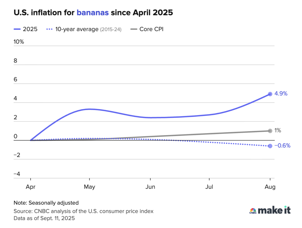 香蕉在 CPI 中通常是穩定的類別,但在四月至八月間異常大幅上漲了 4.9%。由於幾乎所有供應都從中美洲和南美洲進口,美國市場直接暴露於關稅影響下,包括四月實施的 10% 全面關稅。