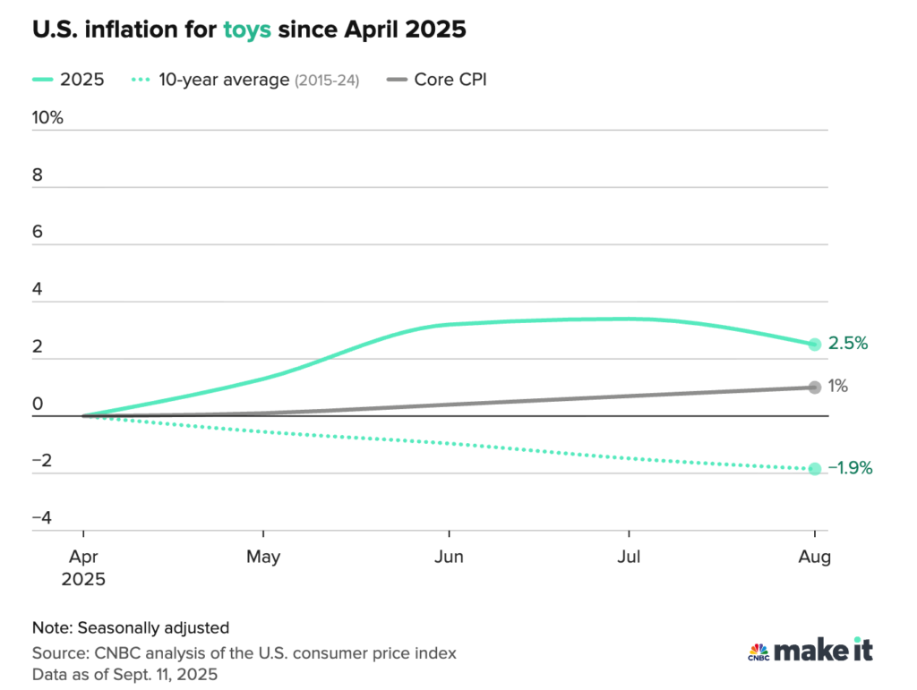 玩具價格在四月至八月間上漲了 2.5%,是自 2021 年以來最陡峭的四個月漲幅。