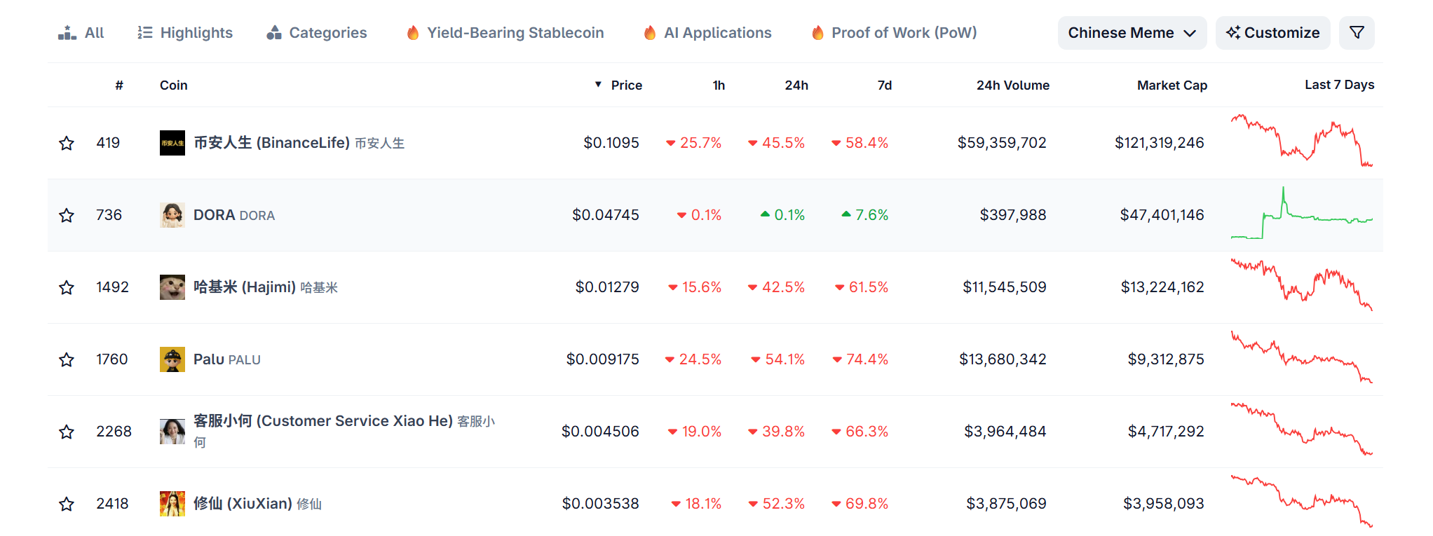 截至 11 月 4 日,中文 Meme 全線潰敗:PALU 一週跌 70%,哈基米跌 61%,客服小何跌 66%,修仙跌 69%。生命週期從週縮短至天,市值門檻從億級降至百萬級,大部分項目存活不到 48 小時。
