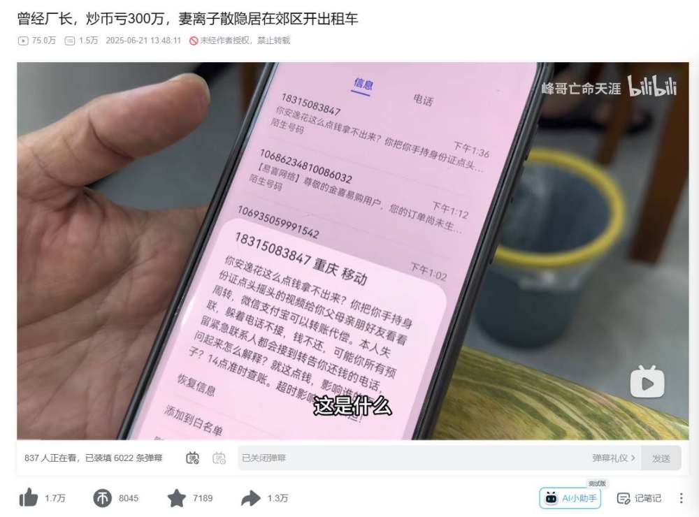 最近,B 站知名 up 主「峰哥亡命天涯」(峰哥),用鏡頭記錄了一位曾經是河北邯鄲某國企副廠長的男人,因炒幣虧損負債 300 萬人民幣,人生就此跌落的故事。