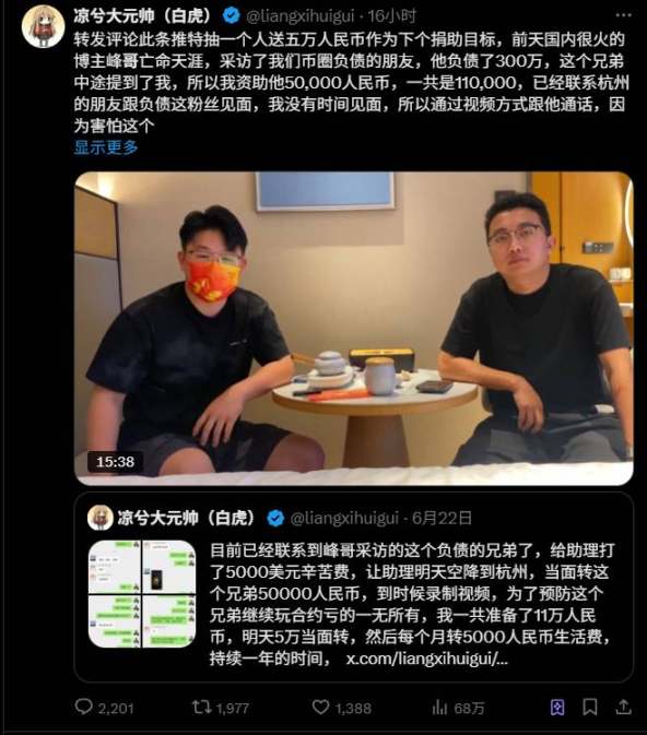 在峰哥的視訊被傳播後,華語幣圈裡最愛開合約的 KOL 涼兮發帖,宣佈要資助重生哥 50,000 人民幣,並額外提供 60,000 元作為一年內的月生活費(每月 5,000 元),以防止他繼續炒幣。