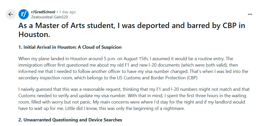 對此背景,在鄉民論壇 Reddit 上,近期一名自稱是中國文學碩士的留學生就公開了自己的經歷:儘管持有有效簽證與護照,但他仍在休斯頓被美國海關與邊境保護局(CBP)審查,CBP 官員對其家庭是否為中共黨員、其本人是否參與中國學生學者聯合會(綜援)等問題反覆盤問,並最終認定他與中國政府存在潛在聯繫,且將一些常見於中國校園的政治表述視為對他不信任的證據。