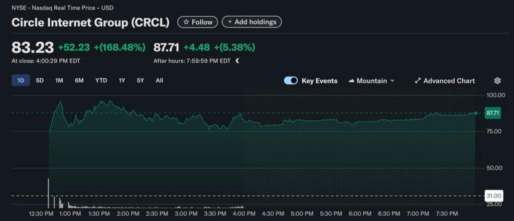 據 Yahoo 財經數據顯示,Circle 股價收盤價為 83.23 美元,漲幅高達 168.48%,市值落在 166 億美元。