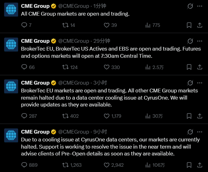 不過慶幸的是,目前,CME 官方已在台灣時間今晚 21:48 左右透過 X 平台表示,其市場已經全部重啟。