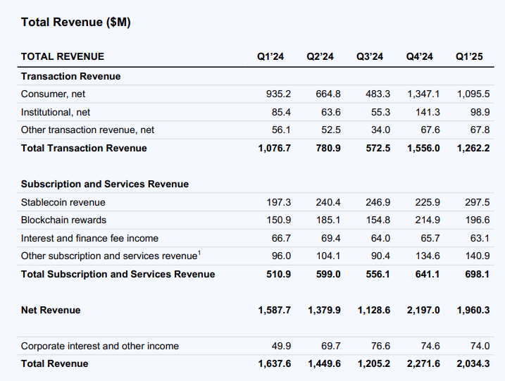 Q1 訂閱和服務收入為 6.98 億美元,環比增長 9%,主要得益於穩定幣和 Coinbase One 收入的增長,其中 USDC 市值創下 600 多億美元的歷史新高。但區塊鏈獎勵收入環比下降 9%,部分抵消了這一增長。下降的主要原因是平均資產價格環比下降,尤其是 ETH 和 SOL。