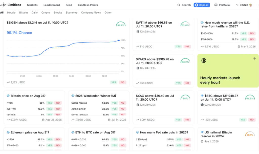 Limitless 是社交預測協議,與「Polymarket」的功能類似,建立者可以輕鬆配置市場並將其與社群分享。而其模組化的 UI 也十分適合在移動端嵌入,同時其 Feed 串流則能夠顯示鏈上其他人或好友的購買情況。
