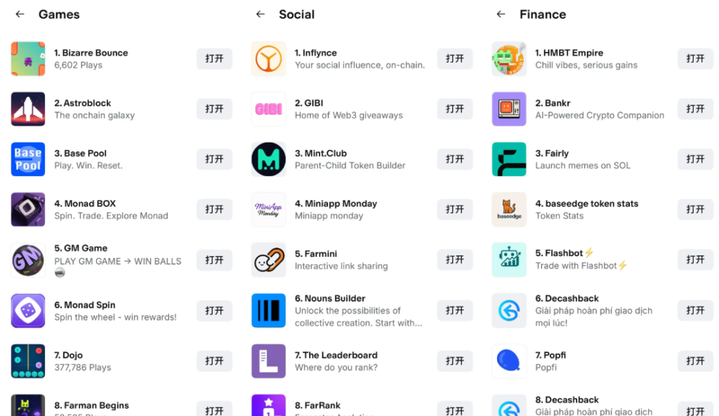 應用則是加密生態內的熱門專案,例如 Noice、Fantasy、Morpho 等,使用者可以直接開啟 Mini App 操作。
