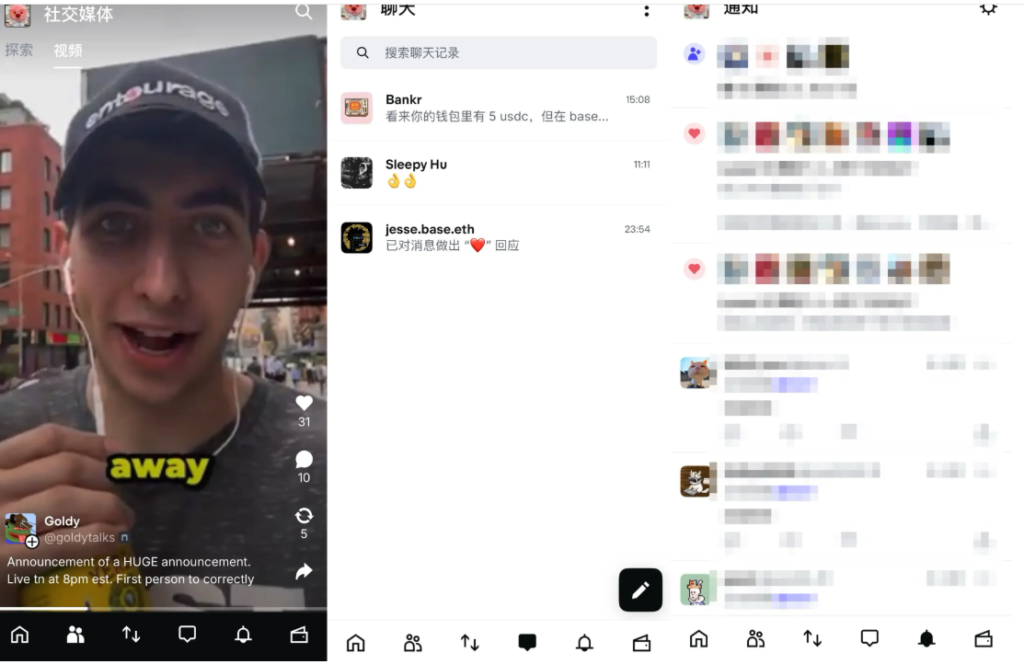 而這次錢包更新最大的改變在於和 Farcaster 的整合,類似於微信的朋友圈,在錢包內彙集了資訊流、視訊、Farcaster 使用者系統、通知等。