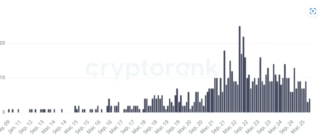 VC 投資的社交賽道數量,在 2022 年左右達到巔峰至今仍在持續增加,源:Cryptorank