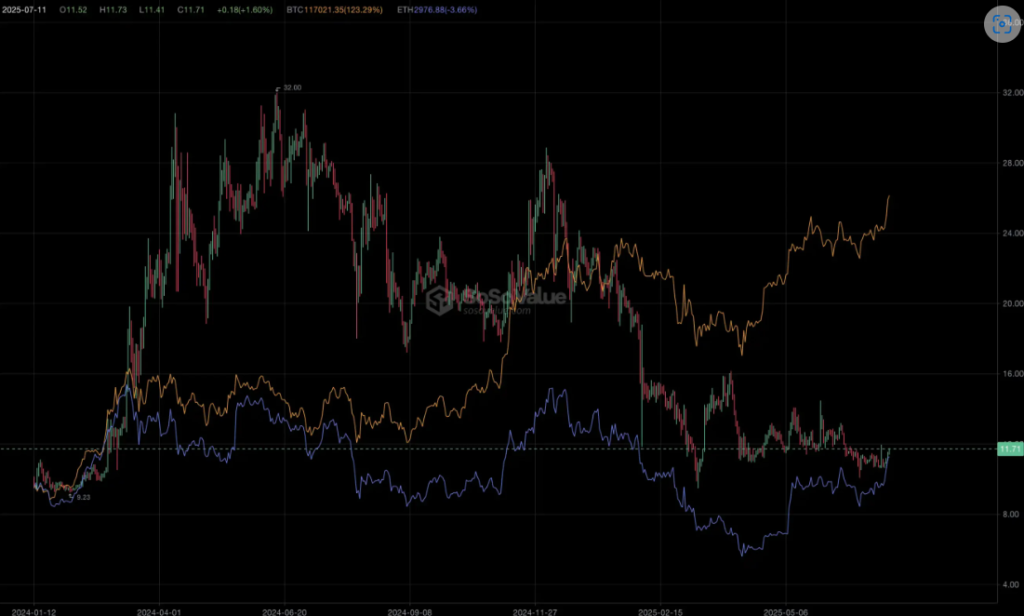社交賽道的漲跌與大盤週期並不相符呈現獨立行情,源:SoSoValue(黃:BTC、藍:ETH、紅綠:社交賽道指標)