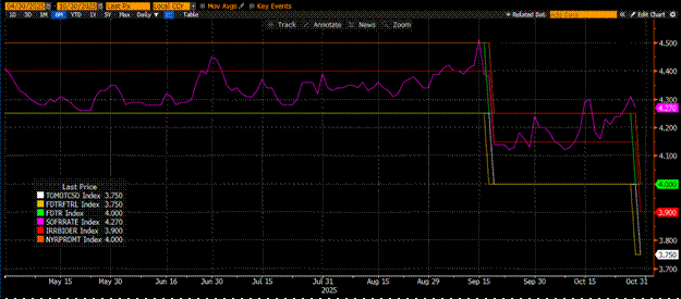 這是一張有用的真實世界數值圖表,用以視覺化這些關鍵美元貨幣市場利率之間的關係。頂部的橙色線(SRF)和綠色線(聯邦基金利率上限)相等。緊接著是紅色線(IORB)。洋紅色線(SOFR)通常在上下限之間波動。黃色線(聯邦基金利率下限)和白色線(RRP)相等。