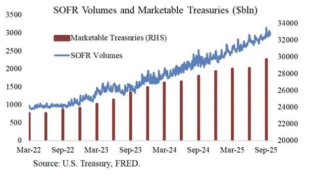 貨幣市場基金的目標是承擔盡可能少的信用風險並賺取短期利率。這意味著貨幣市場基金主要透過將資金停泊在逆回購機制(RRP)、在回購市場出借現金以及購買短期國庫券(T-bills)來獲取回報。[2] 在這三種情況下,他們承擔的是聯準會或美國財政部的信用風險,這基本上是無風險的,因為政府總是可以印鈔來償還其債務。在RRP資金耗盡之前,存放其中的數十億或數兆美元會為回購市場提供現金。這是因為 RRP < SOFR,所以一個追求利潤最大化的貨幣市場基金會從RRP中取出資金並在回購市場中出借。但現在RRP的餘額為零,因為短期國庫券的利率非常有吸引力;貨幣市場基金透過向美國政府放貸來最大化利潤。