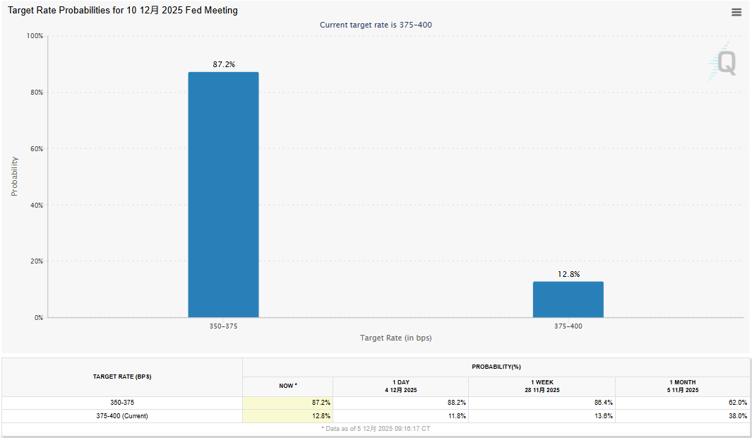 受這一數據影響,也進一步強化了市場對聯準會在 12 月的 FOMC 會議上,再次降息 25 個基點的預期。據芝商所 FedWatch 工具顯示,目前這一機率為 87.2%。