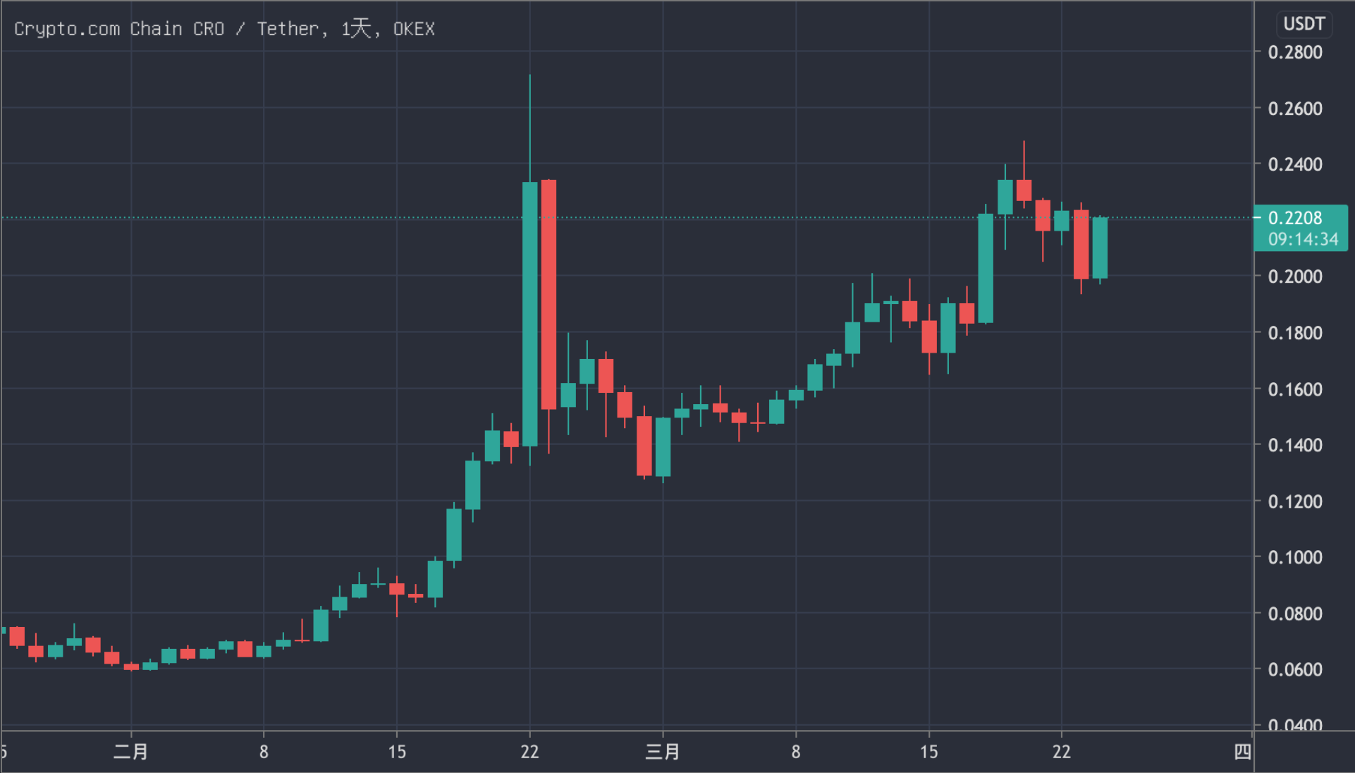 在即將推出 NFT 平台的消息發出後,Crypto.com 的平台幣 CRO 也順勢上漲。據 TradingView 數據顯示,CRO 今日大漲了 10.55%,從0.199 美元上漲至 0.22 美元,截稿前暫報 0.2208 美元。
