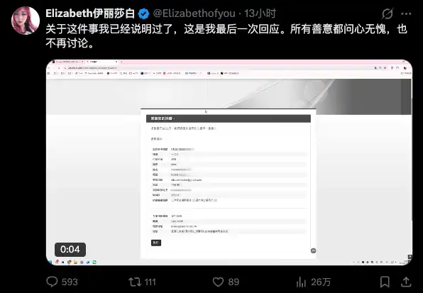 面對鋪天蓋地的質疑,伊丽莎白於 1 日晚發布影片回應。她在影片中堅稱自己「已捐款,問心無愧」,並表示這是最後一次回應,隨後展示了另一張截圖。