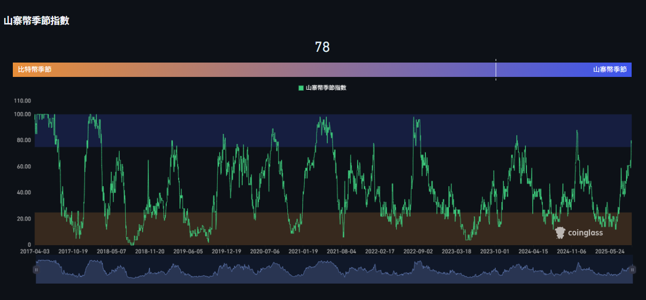 據 Goinglass 數據顯示,或許由於市場幾乎完全確定美國聯準會將在下週的 FOMC 會議上重啟降息,並有望在今年連續降息,市場情緒大有改觀,目前山寨季指數已經來到了 78。