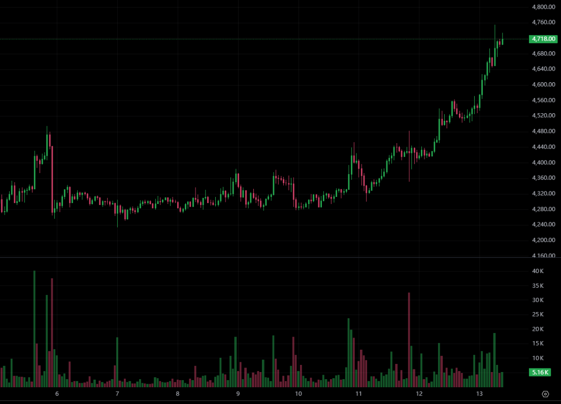 加密貨幣全線拉漲!在本週四(11)美國 8 月 CPI 報告出爐後,加密貨幣經過短暫休整,在週五(12)深夜啟動漲勢,比特幣撰稿當下已突破 11.6 萬美元,最高時衝上 116,666 美元,近 24 小時漲幅達到 0.7%;以太坊上漲動能更加強勢,撰稿當下暫報 4,722 美元,最高時衝上 4,754 美元,近 24 小時漲幅達到 3.9%。