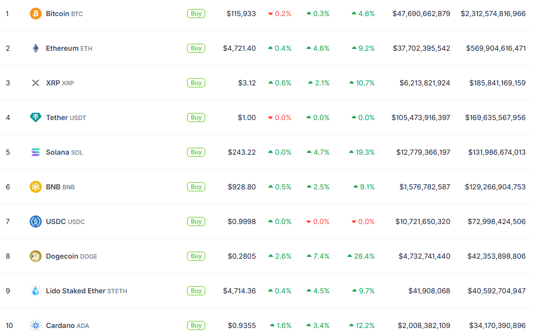 加密貨幣全線上漲,比特幣突破 11.6 萬美元,以太坊衝上 4,700 美元。